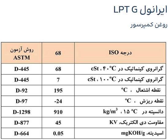 روغن کمپرسورایرانول LPT- G با استفاده از روغن پایه نفتنيک گزينش شده تولیدگردیده است.