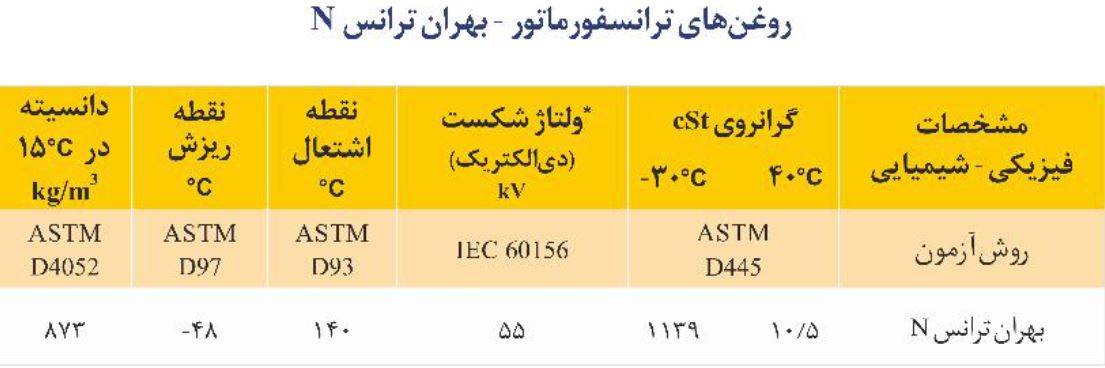 بهران ترانس N، روغن عایق الکتریکی است که با استفاده از روغن پایه معدنی پالایش شده و بدون استفاده از ماده افزودنی ضد اکسیداسیون تولید می شود. بهران ترانس ll عاری از ماده شیمیایی 1 PCB = Polly Chlorinated Bipheny است. موارد مصرف این محصول در انواع ترانسفورمرها، به ویژه ترانسفورمرهای پرقدرت است.